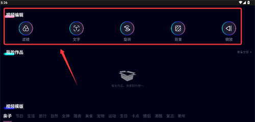 3、进入编辑页面时,您可以使用过滤器和文本添加等功能来处理视频材料。