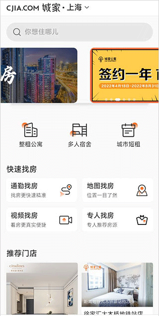 1、下载并登录城家公寓应用程序,进入主页,您可以看到有全租公寓、多人宿舍和城市短期租赁。您可以通过通勤、地图搜索、视频搜索和专人搜索快速找到房子。