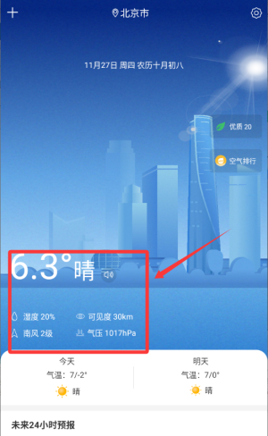 2、红色框中显示的湿度、能见度和气压等。