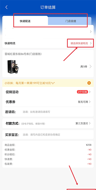 3、选择配送方式后,点击提交订单继续。