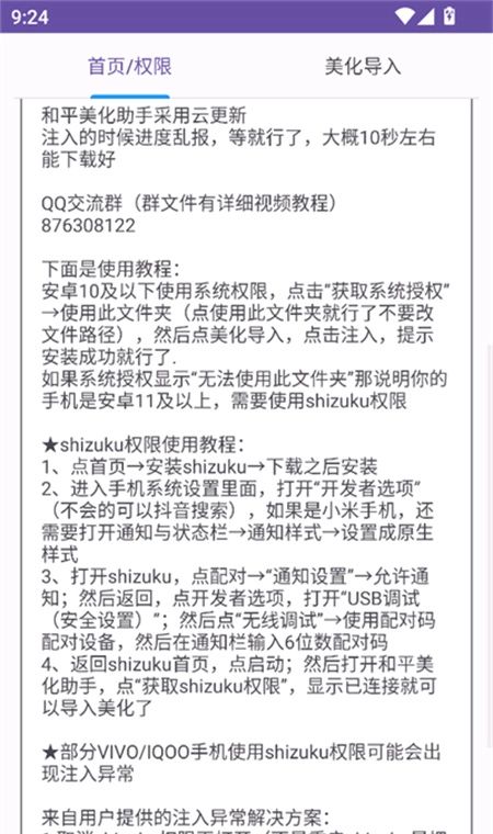 1、进入首页后需要先获取系统授权,也可以点击获取shizuku权限。