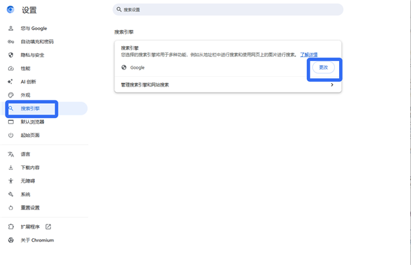 3、选择【搜索引擎】这一栏,点击【更改】。