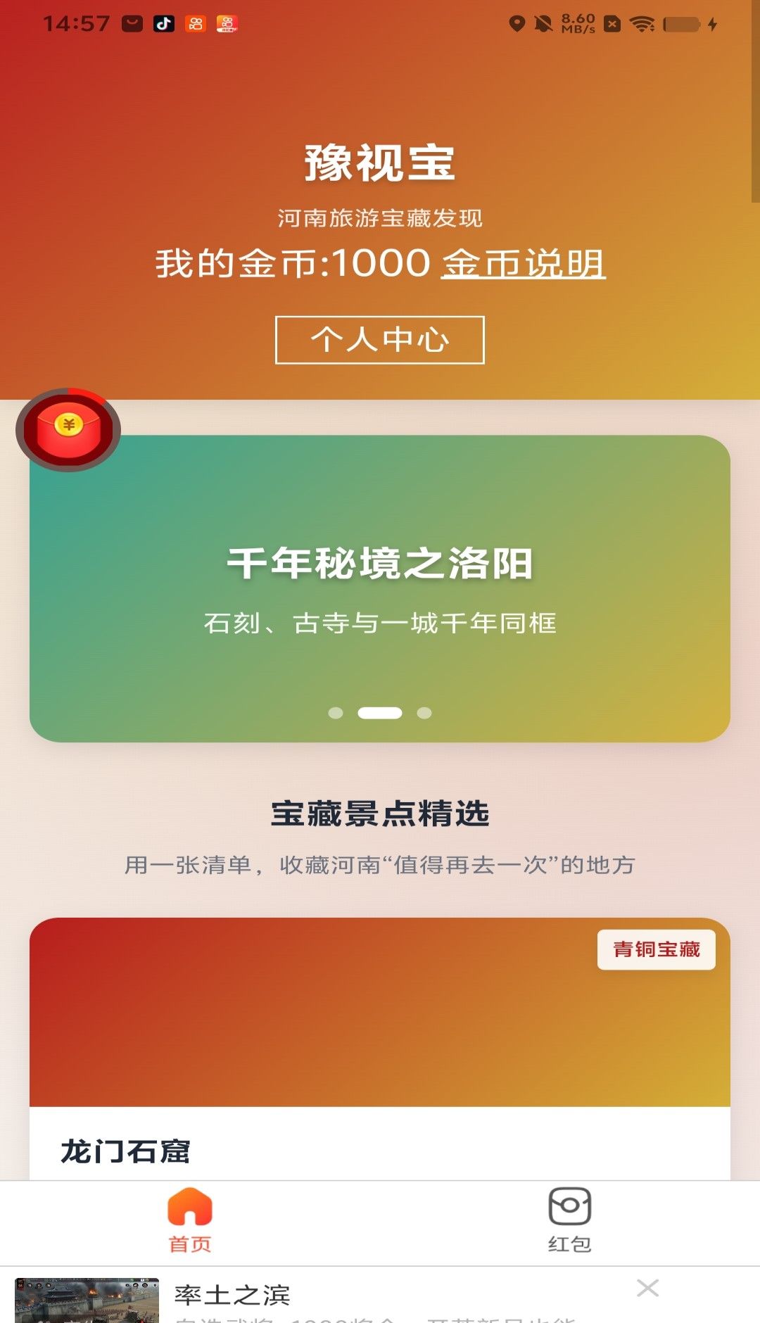 御史宝是一款专门为河南文化和旅游行业设计的实用指南应用,让你只需一键解锁中原大地上的千年宝藏。无论你是想深度参观龙门石窟等世界文化遗产,探索郑州周边隐藏的景观和青铜宝藏,还是想通过有趣的互动了解河南文化,它都能为你提供周到的指导。在这里,我们精选了众多 “值得再去一次” 的河南目的地,搭配互动宝藏竞猜和金币福利玩法,让你在趣味探索中规划河南深度之旅,轻松感受中原厚重的历史和惊艳的风光,成为你解锁河南宝藏的专属向导。