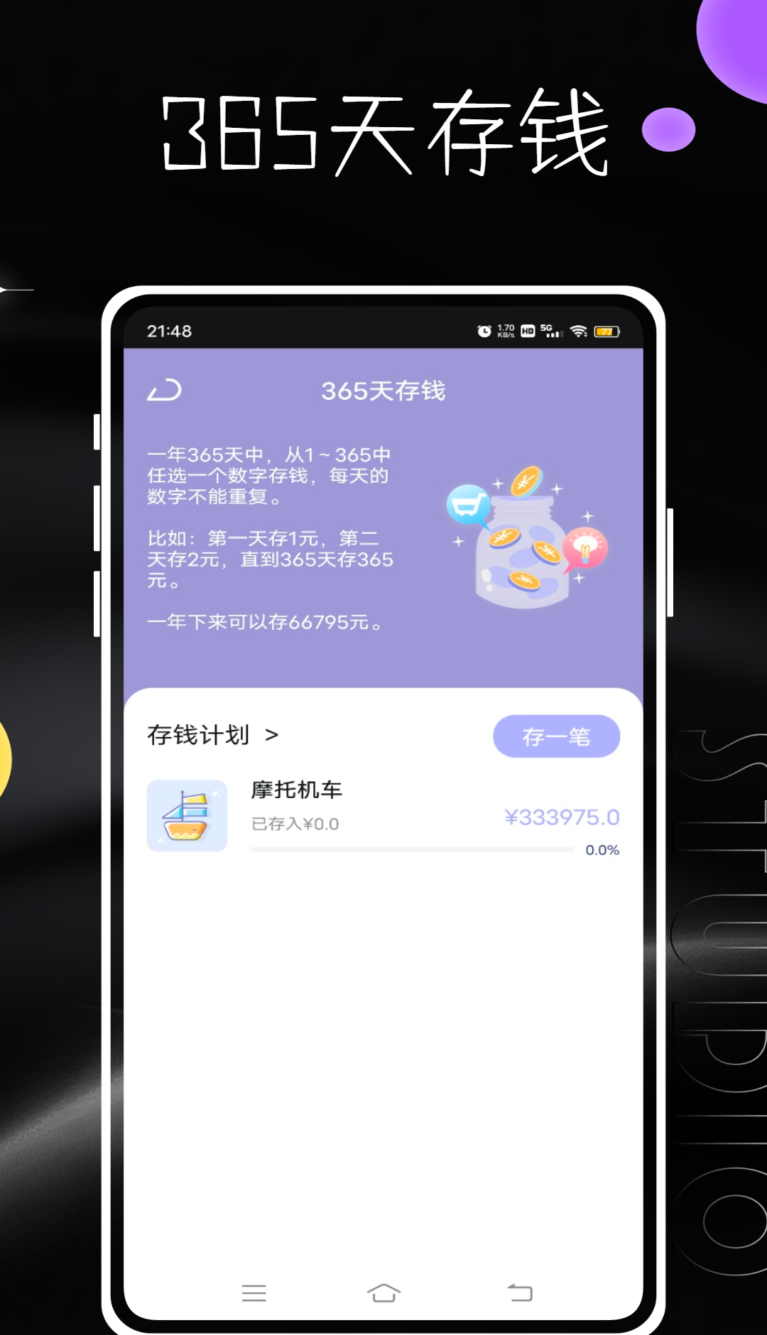 1、提供365天储蓄计划,每天增加存款金额,全年轻松积累可观的储蓄。