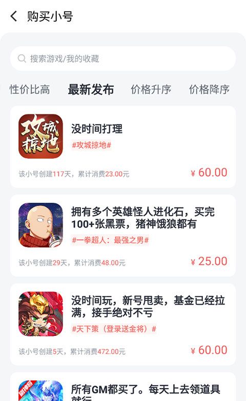 4、例如点击:购买,就可以看到很多其他玩家最新发布的信息、区服以及价格。