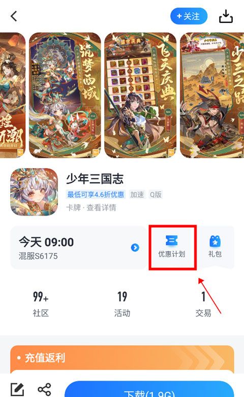 1、选择你要充值的游戏,进入游戏介绍界面,点击“优惠计划(优惠充值折扣+代金券)”。
