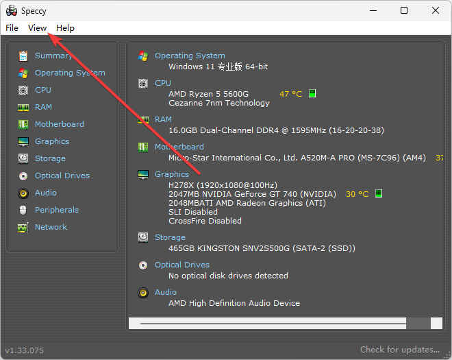 1、打开Speccy,点击左上角的view