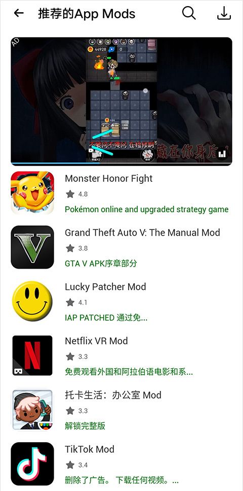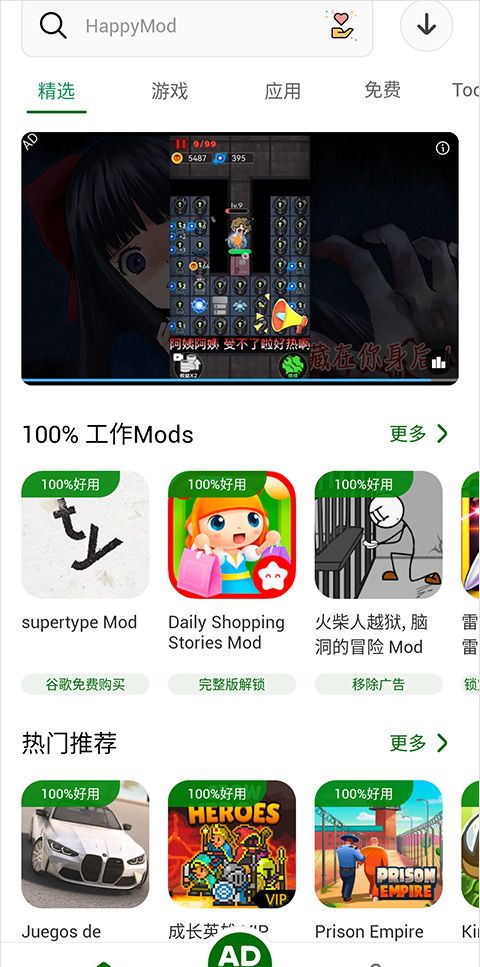 4、100%免费HappyMod免费为你提供任何你喜欢的修改后的应用和游戏。这是一个修改过的APK商店。
