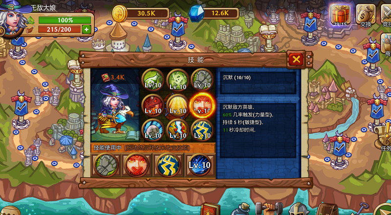战斗中,英雄击杀敌方单位,或随着战斗时间的增长,英雄的技能能量条都会随之增长,当技能能量条满后,便可点击英雄头像,释放技能。