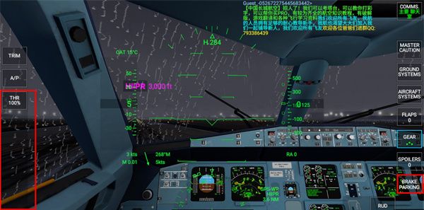 4,调整好襟翼后,我们就可以松开刹车BRAKE,然后滑动左侧的油门THR,将油门推到100%。