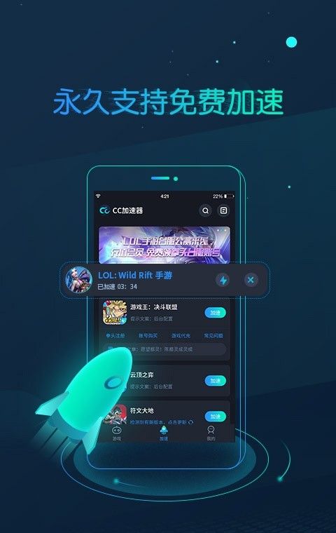 CC永久免费加速器APP提供了非常强大而且便利的游戏加速服务,各类游戏都可以直接加速体验。为用户打造一款简单易用的游戏加速器工具,提高手机游戏网络的稳定性,一键解决手机游戏网络卡、掉线、延时、加载缓慢等问题,彻底告别影响游戏体验的一系列网络问题,为您的游戏之旅保驾护航。海量游戏,免费体验,稳定的全球线路加速,带给你极致的游戏体验,让你的游戏时间不再流逝。