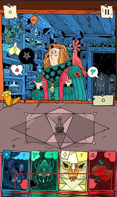 学会制作药水之后,接下来玩家便可开启商店完成营业了,记住来到这里的每个客户都有特殊的订单,其中上面的文字泡泡显示了它想要的药水原料,你必须至少使用1张客户想要的配料卡,否则游戏结束,