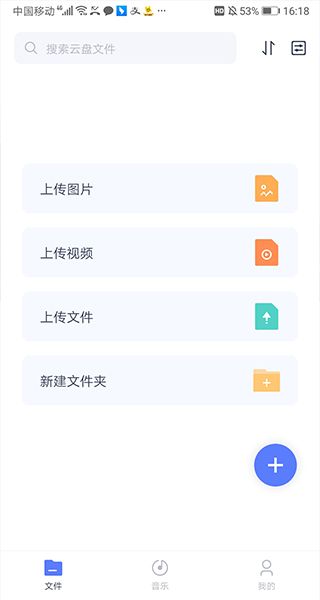 1、打开应用即可根据文件类型将文件上传到云盘中。