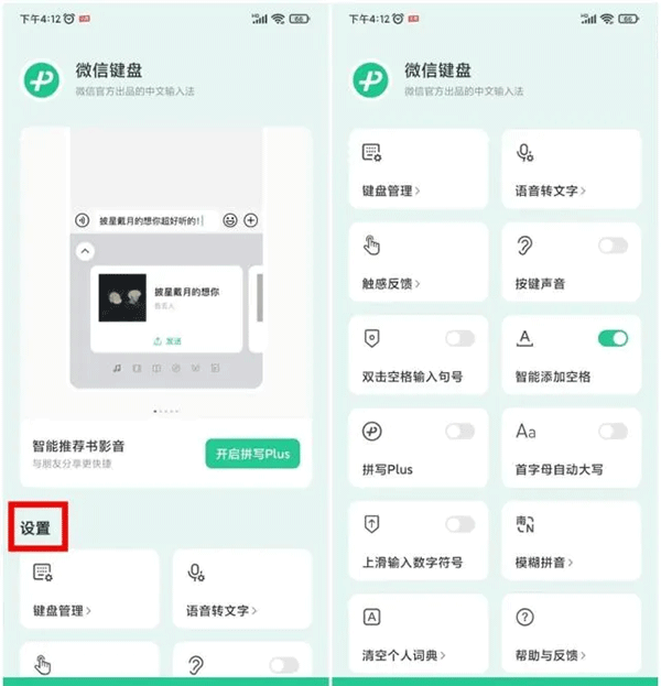 2、进入后可以看到“微信键盘”的各种功能,比如“语音转文字”、“触感反馈”、“智能加空格”、“模糊拼音”等等。