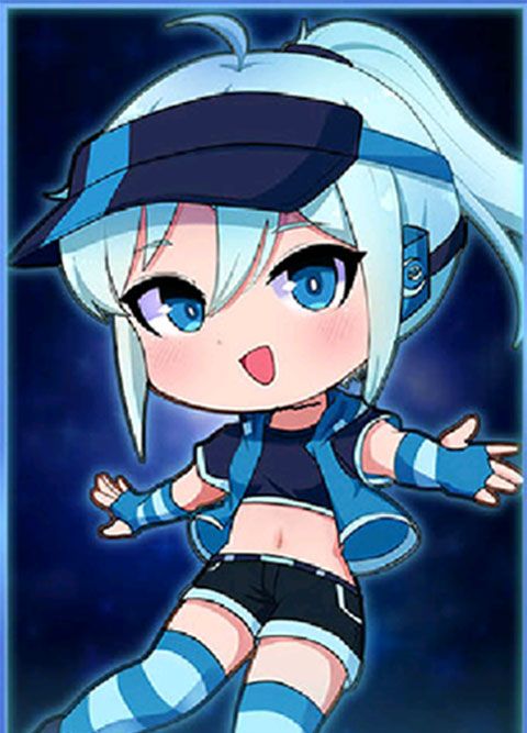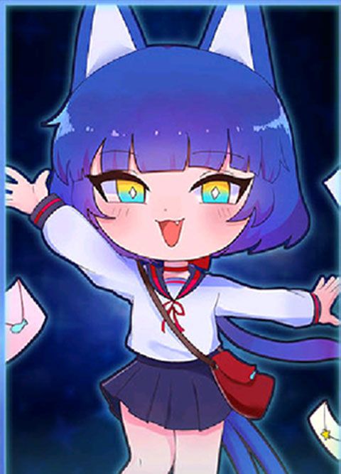 蓝色头发,有一对猫耳,穿着蓝色短袖上衣,黄色短裤,戴着白色手套,在卡牌中是校服,性格比较开朗。