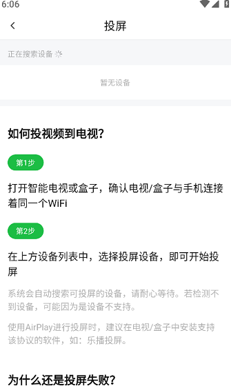 3、将我们的手机和电视连接同一个WiFi,然后点击搜索出来的投屏设备开始投屏即可。