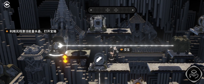 在进入到第1个关卡时,难度真的很简单。玩家可以开启寻宝人的挑战,先直接跳到第1个交互点,接着又跳到第2个交互点完成光线的调整之后就可以拿到奖励。那第2个关卡就是直接跳到平台上,接着跳到第2个平台,只需要点一下交互,就可以让镜面翻上去。这个时候的平台就可以慢慢的降到底,等到落地之后往左边跳,可以精准的落到中央交互点的位置。