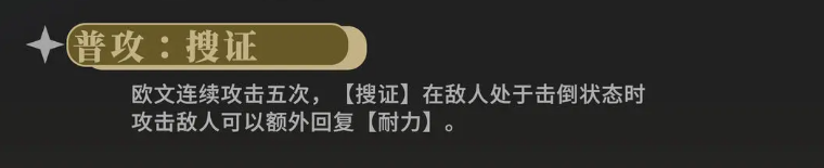 他本身装备的电气动力全套就是欧文的一个基础武器,可以根据全套的效果进行格斗类的攻击,因为他本身是格斗类型的角色,所以在输出上面也会根据这一点带来足够的怒气积累,他在普攻上面有一个搜证的能力,也是可以连续带来5次输出的,同时只要是在搜证的效果之内,那么敌人只要是处于击倒状态,欧文带来的输出能力会更多一些,而且还可以为自己带来怒气提升的效果。