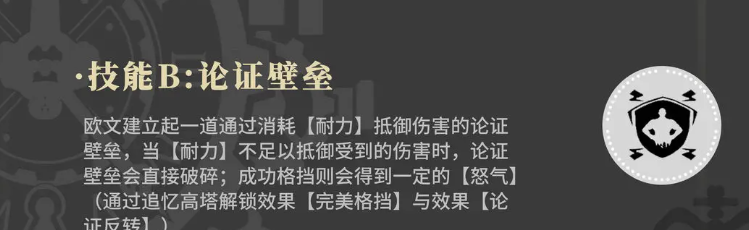 而且在上面如果是耐力不足的情况下抵御受到的伤害时,这个壁垒会直接破坏,所以大家可以看作是护盾效果,这个护盾如果在欧文本身耐力不足的情况下使用的话,阻挡的伤害数值是会导致这个护盾破掉的,所以大家需要计算双方的伤害数值,以及护盾数值,当然如果这个壁垒成功格挡则会带来更多的怒气数值积累效果,后期大家解锁超解技的话,还可以变成完美格挡的效果,完美格挡是指一定会将敌方的这一击给全部挡下来,这个技能其实如果是面对敌方大招输出的话,还是具有非常好的防御效果。