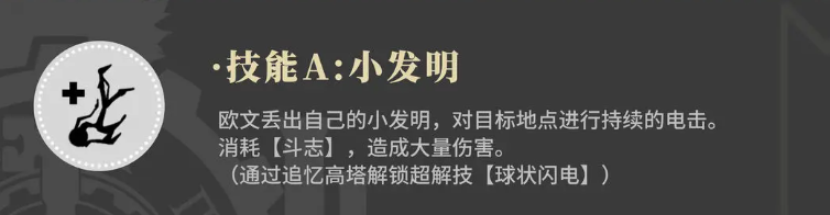 在技能一上面,欧文有一个小发明的技能,使用这个小发明技能的时候,他可以找到一个目标地点,在这个目点地点范围之内可以带来一定的电击,而且电击的效果是持续性的,不过有斗志效果加成的话,这个电击会造成更大量的伤害,后期如果大家把这个技能解锁为超解技的话,还可以变成球状闪电的能力,球状闪电带来的整体电系输出影响会更大一些,他的技能二叫做论证壁垒,这个技能会给大家带来更多的耐力数值效果,战斗里面使用论证壁垒,会消耗自己前面积累的耐力数值来抵御对方带来的伤害。