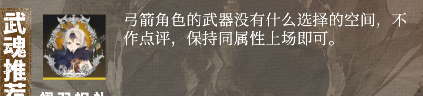 翎羽祝礼:是一个比较适合弓箭角色搭配的武魂,整体的效果是体现在武器家和才能上面的,其实现在的弓箭类角色在武魂上面没有什么选择的空间,相对其他的武魂来说翎羽祝礼带来的属性搭配数值是最好的,只要保持同属性上场就可以触发武魂效果,所以这也是目前最推荐此类角色搭配的武魂。