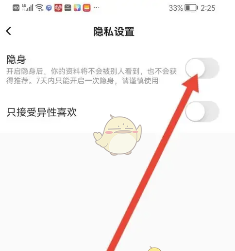 4、来到隐私设置,然后把【隐身】的按钮开启。