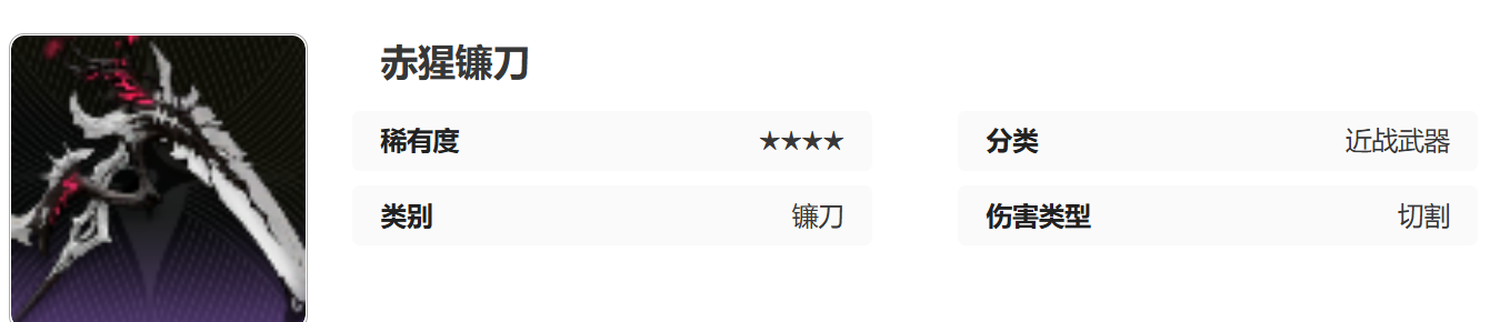 赤腥镰刀虽然稀有度只有4星,不过武器也是近战类型,伤害方式和希冀的丰焾一样都是切割方式。