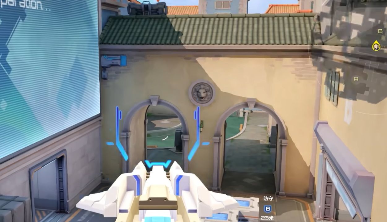 反观防守一方,在这张图需要注意的点位就比较多了。在回合开始时需安排人立刻来到中路,看是否有人从大酒店走并确定他们走哪个方向,好判断出攻方的动向,若有机会可收过路费。当中路没人时,可采用1中路2A区2B区的防守分配。其中A区可一人踩高点拿信息一人在低点准备战术道具反制,看到人后立刻丢道具拖时间等队友回防。B点也是一样,可在B侧房放一人,B区点位内放一人,由B侧房的人拿信息。中路的队友则可一直盯着大酒店里的动静,防止攻方在佯攻后采用集体出中的进攻套路。