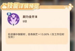 还有一个全体性的技能就是厨艺交响,店铺中所有店员的厨艺都增加150,店铺非常忙碌的时候,可以立即派遣皮皮上阵,带动店铺中的店员们以最大效率参与到工作环节中去。像美食仙人学习还能额外获得食谱秘料6.5%,多多学习才能够让自己变成美食学霸,在厨艺界更能够鼎鼎有名,等级越高时能够解锁的星技能就会越多,各项属性值也会增加不少。