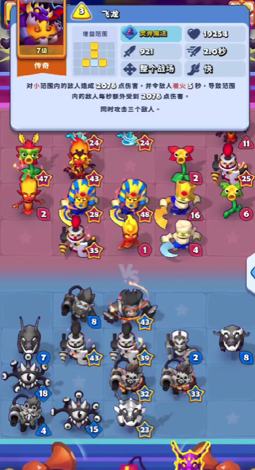 由于飞龙隶属于灵异魔法系角色,所以在搭配方面,玩家可以使用豌豆花,亦或是祭司等角色,来扩散飞龙的灵异魔法效果,使得三个单位的敌方目标判定,能够扩散成为十个目标以上。