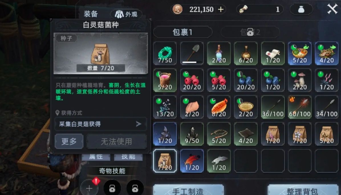 种好后的白灵菇只需等上一段时间就会成熟,各位可像野外收集资源那样对它进行采摘,且有概率能再次拿到白灵菇菌种,让自己能接着在蘑菇种植箱里继续进行白灵菇的培育,以此来源源不断的获取白灵菇。倘若没能拿到菌种,则可去野外进行收集,然后再回来继续种植。通过种植各位可拿到大量的白灵菇,效率远比前往野外进行收集要来高,而且种植后只需进行浇水这一项操作,整个种植过程可谓十分的方便,因此更建议在拿到白灵菇菌种且解锁了蘑菇种植箱后,用种植的方法来获取它。