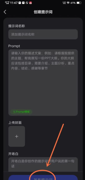 4、填写提示词资料和屈泪上传模板,点击“发布提示词”按钮,发布成功后即可创建提示词。