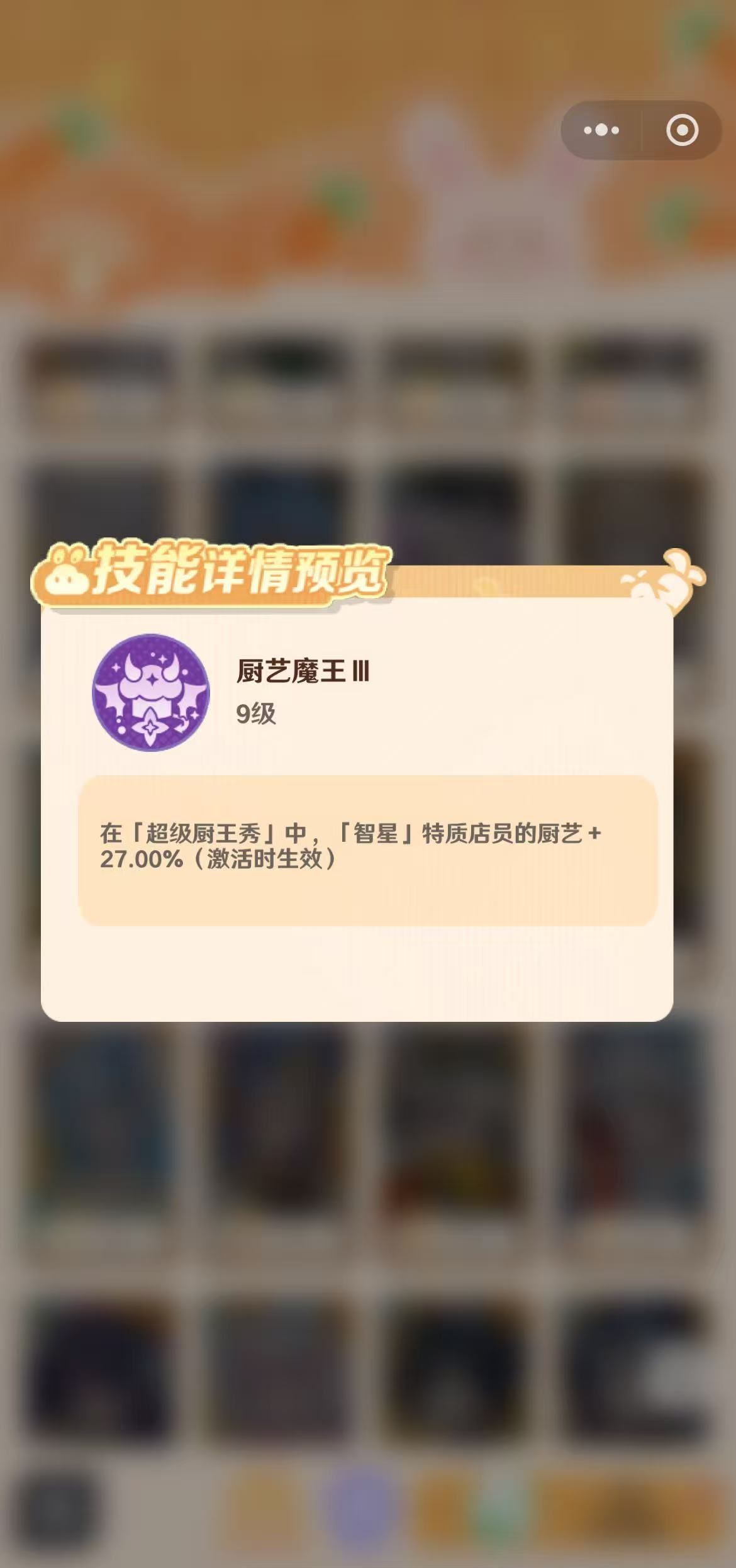 厨艺方面是100分,虽然烹饪的技巧不是一流的,但是店铺经营时的效率却能够达到34%。客流量非常多的时候,能够提升22.3%的移动速度,就算同时出现多个订单时,也能够很快的操作相应的机器完成。