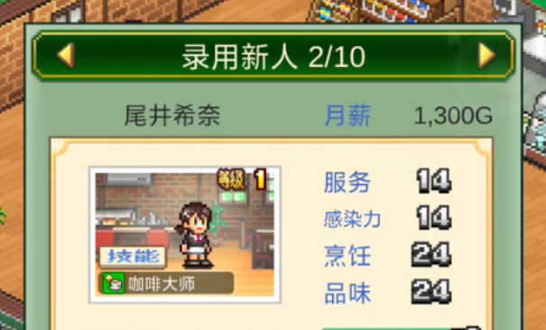 这款游戏中员工的技能以及职业定位是相互的,那么每一个职业所需要的技能都是不同的,大家可以根据职业将员工分成两个不同的部分,首先是烹饪类型的,还有一种是服务类型的员工,其中主要烹饪类型的员所需要的技能会更加的丰富,包括制作饮料以及餐食,这两种选择,那么在制作饮料的时候需要去点咖啡大师或者果汁大师,这种技能那么这些技能都可以帮助员工在制作对应饮品的时候获得相应的加成。