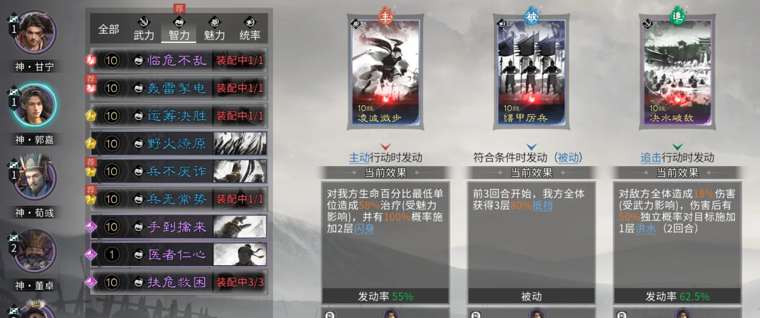 这个搭配其实是属于比较出名的一个国家队的这个阵容里面,他整体的防御能力也是比较肉的,而且加上了一定的群体攻击,在这里黄月英跟诸葛亮还有额外的羁绊加成可以提升,所以在国家队效果上面来说,绝对是很适合新手用来进行开荒的,就算没有赵云大家也可以上甘宁,这样这个阵容基本所有的玩家都有机会组成,那么后期大家如果提升自己国家队的强力,还有一个搭配就是荀彧加上郭嘉加上许褚。