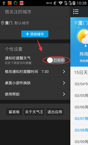 2、接着左侧会弹出功能列表,选中【通知栏提醒天气】将其开启(ps:这个提醒仅在下雨天时提醒哦)