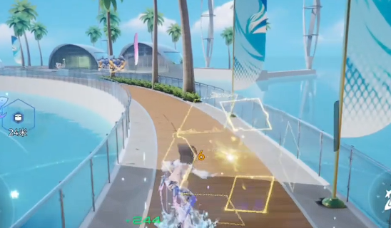第二个技能则偏向于直接输出,释放后可进入冲浪状态向前冲锋并撞击敌人造成伤害。此过程会积累“升浪值”,当数值累积到阈值后将触发额外的二次打击效果,进一步增强清场能力。