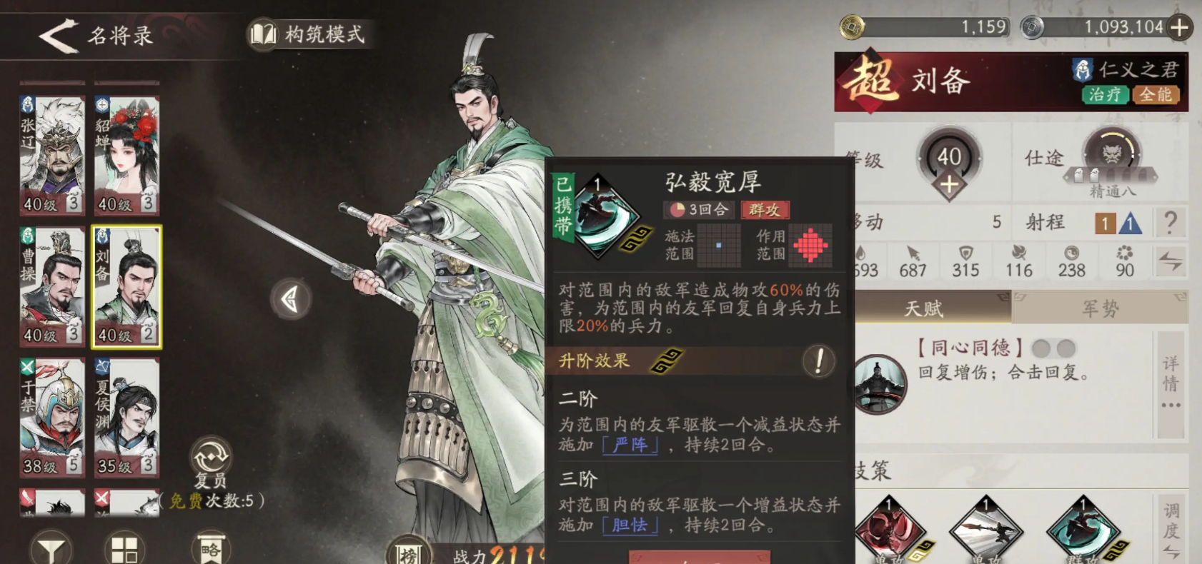 技能“弘毅宽厚”能够对范围内的敌军造成相当于其物攻60%的伤害,并为周围队友恢复20%兵力。晋升至2阶后,还可驱散范围内友军的一个减益效果,并施加持续2回合的“严阵”状态;升至3阶时,则会对范围敌军清除一个增益,并附加2回合的“胆怯”负面状态。