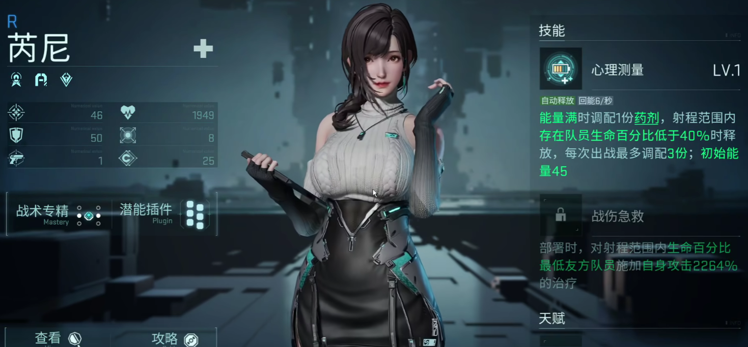 芮妮基础战斗技能是心理测量,当能量值蓄满后,她会主动调配一份药剂,对于射程范围内的所有队友,释放一次治疗,同时,当前仅当队列内存在生命数值,低于其生命百分比40%时,才能够释放。
