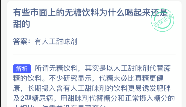 以上就是有些市面上的无糖饮料为什么喝起来还是甜的,支付宝蚂蚁庄园2025年10月27答案最新,更多精彩内容,请点击关注更新!