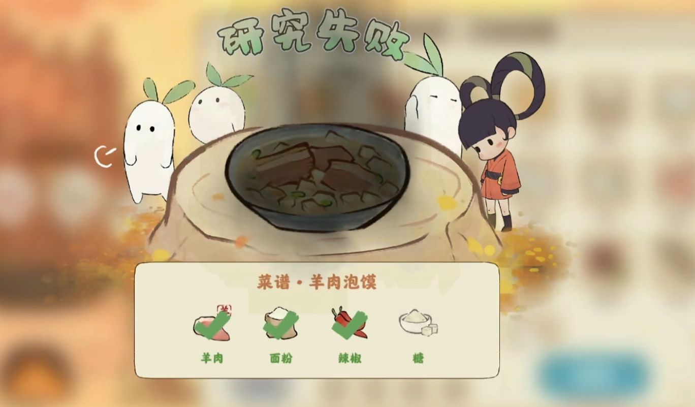 倘若玩家所选的食材与菜谱里的材料不一样,那就会制作出失败的美食。但没关系,菜谱研究是不消耗任何材料的,所以各位可重复尝试。而且各位在选择食材时,一旦选定了食材,那么该食材就会显示在菜谱里,不管各位是否将美食制作出来都是如此,各位大可将试出的食材与其它未尝试的食材进行搭配,直至将全部的食材都试出来并点亮菜谱为止,整个过程也只需进行排列组合,不需要太过复杂的操作,很轻松就能完成。