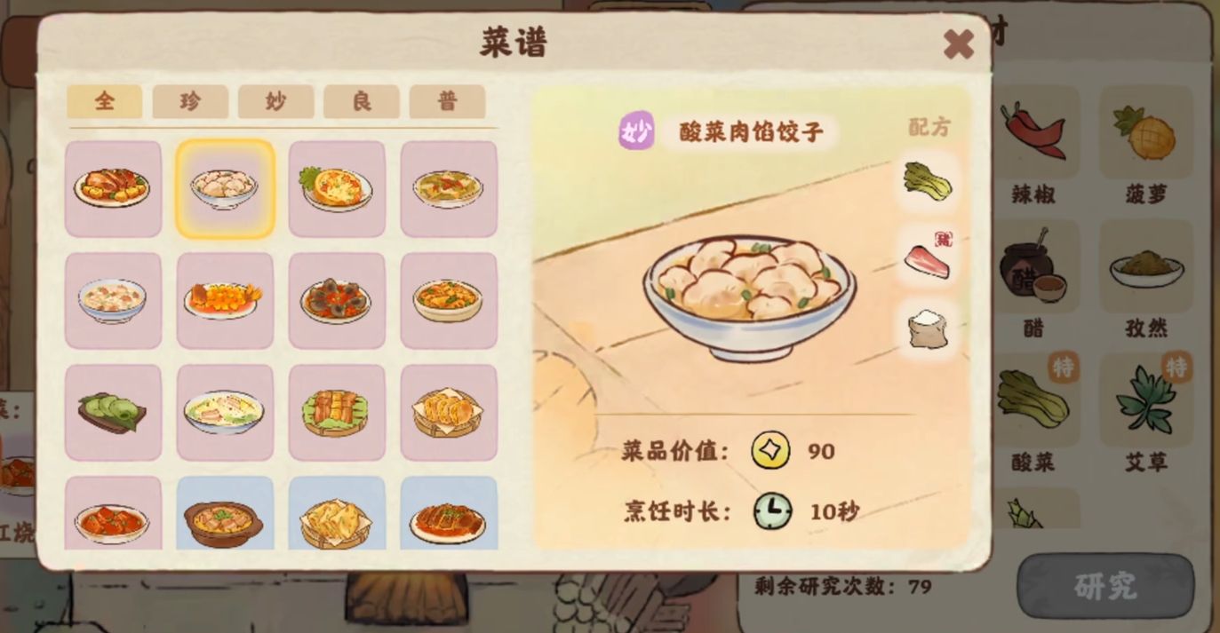若各位想去学习更多的菜谱,也可去参与食来运转活动。只要前往吉祥楼开店,就能在这里研究各种新的菜谱。它里边的研究玩法与厨艺等级中的研究方式一样,都需要人们搭配不同的食材来探寻出每道菜谱的食材组合,且研究时也不需要消耗任何的材料。但要注意食来运转活动每天的研究次数有着100次的上限,若各位用完了100次只能等到第二天再进行研究。此外,这里能解锁的菜谱有妙品、良品和普品三个等级,其中妙品美食的开店收益最高,所以各位最好优先去解锁该品质的菜谱,好完成此活动的经营目标。