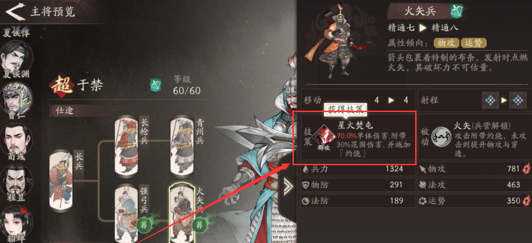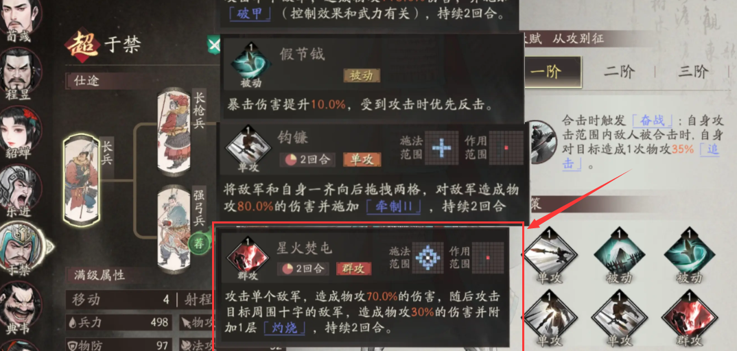 于禁大招效果“星火焚屯”,冷却时间两个回合,属于群攻技,可以攻击单个的敌方目标,同时造成物理攻击70%的伤害,随后伤害会扩散,对周围十字目标的所有敌方军队,造成基于自身物理攻击30%的伤害。