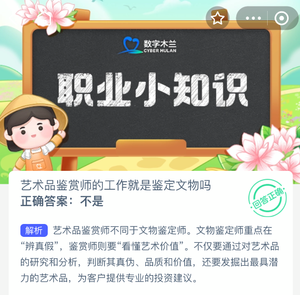 艺术品鉴赏师的工作就是鉴定文物吗?【蚂蚁新村每日一题】2025年10月30日题目已发布!坚持答题,积累木兰币,即可加速小镇建设。答对本题,立即可享“产速+3/时”的加速奖励!今天正确答案是【不是】。艺术品鉴赏师不同于文物鉴定师。文物鉴定师重点在“辨真假”,鉴赏师则要“看懂艺术价值”。