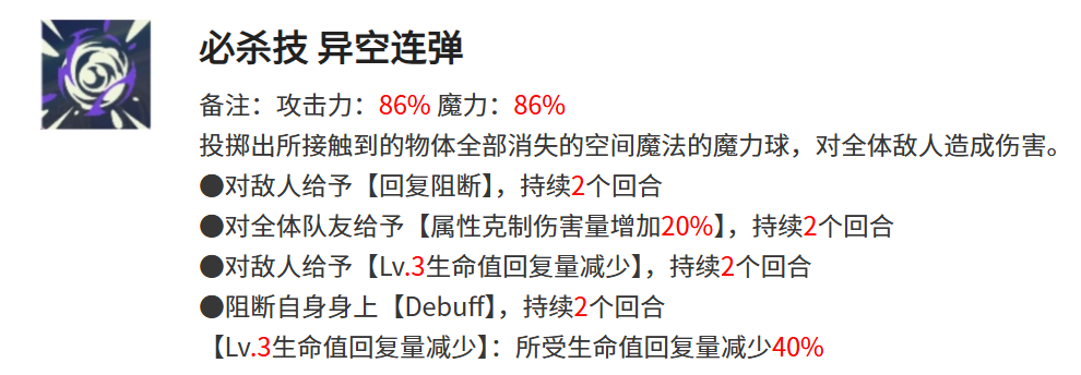 异空连弹是兰吉尔斯的必杀技能,该技能的攻击力和魔力均为86%,该技能使用后,兰吉尔斯会向敌人方向投掷出能够将所有接触的物品全都给消失的空间魔力球,空间魔力球在接触到敌人时,还会给敌人附加上回复阻断的效果和生命值回复量减少的效果,给我方全部的队友附加上属性克制伤害量增加20%的效果,最主要的是该技能可以直接将自身的Ddbuff给阻断。