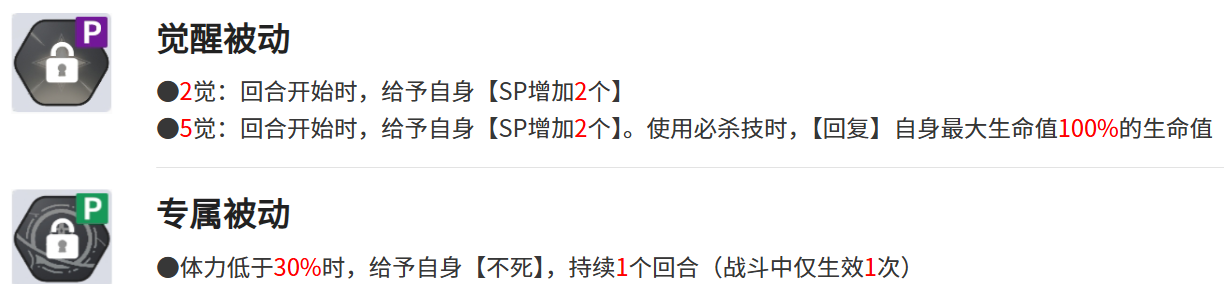 觉醒被动技能分为2觉和5绝,2觉能够给自己身上附加上2个sp,5觉在附加2个sp的基础上,兰吉尔斯使用必杀技后,还能恢复自身最大生命值100%的生命值,专属被动技能则是在兰吉尔斯的血量低于30%的时候,给自己赋予上不死的状态。