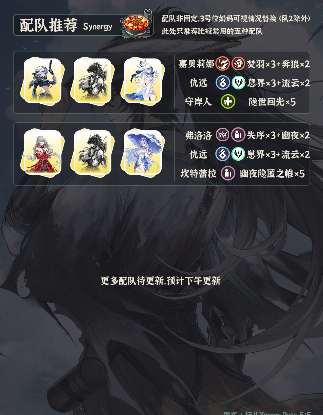⑤ 仇远当前主要和嘉贝莉娜组队,其次可以考虑弗洛洛队代替洛可可。其余配队待更新。