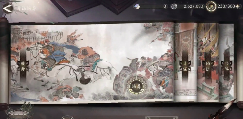 在参谋室当中,鼓舞、计谋、陷阱和兵阵这四类奇谋中,玩家们可以先培养计谋类和兵阵类,计谋当中的伏兵之策,能够选择三个友军进入到服兵状态2回合中,此时就无法被敌方进行选中,可以与敌军进行混战,当敌军的因混乱战术智力达到70以下,则可使敌方部队的双抗降低50%。