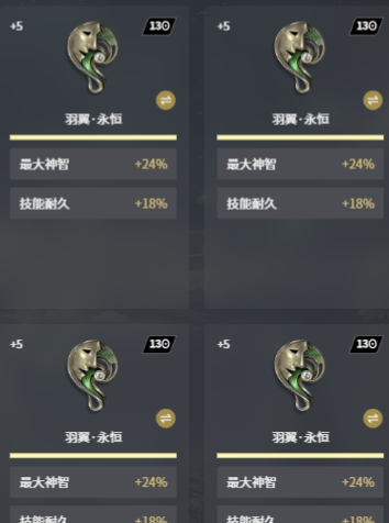 剩下的位置可以选择全带羽翼永恒,如果选择这一个,那就可以增加24%的最大神智以及18%的技能耐久,可以进一步的堆高神智,让技能的循环更加的顺畅,而且还可以叠技能耐久。保证技能是不会断档的,这就是一个百搭的选择,主要的优势就是稳扎稳打。根据这一些方向去挑选,那自然就会拥有更好的优势,因此大家就可以关注一下。