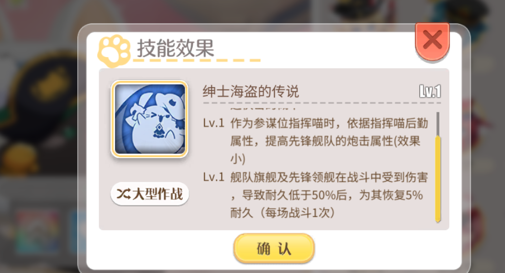 从属性配置来看,邦尼喵在后勤类数值上有不错的表现,尤其体现在耐久、炮击与航空方面的增益效果。其拥有的固定天赋包括:不动(全队减伤3%)、战旗重扬(提升轻巡、重巡及风帆舰种的炮击与装填各10点)、小小的奇迹(舰队幸运值+5)、炮火覆盖V(增强轻巡、重巡、超巡及风帆舰种的炮击能力),以及轮机长·先锋(先锋编队耐久增加60点)。